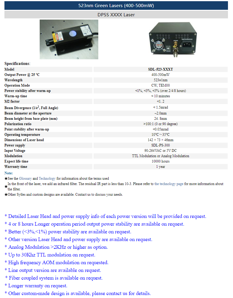 | 523nm | 400 ~ 500mW | CW | TEM00 | |