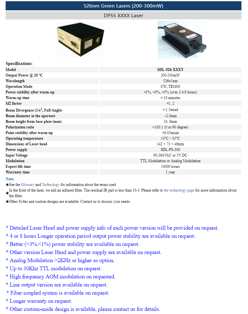| 526nm | 200 ~ 300mW | CW | TEM00 | |