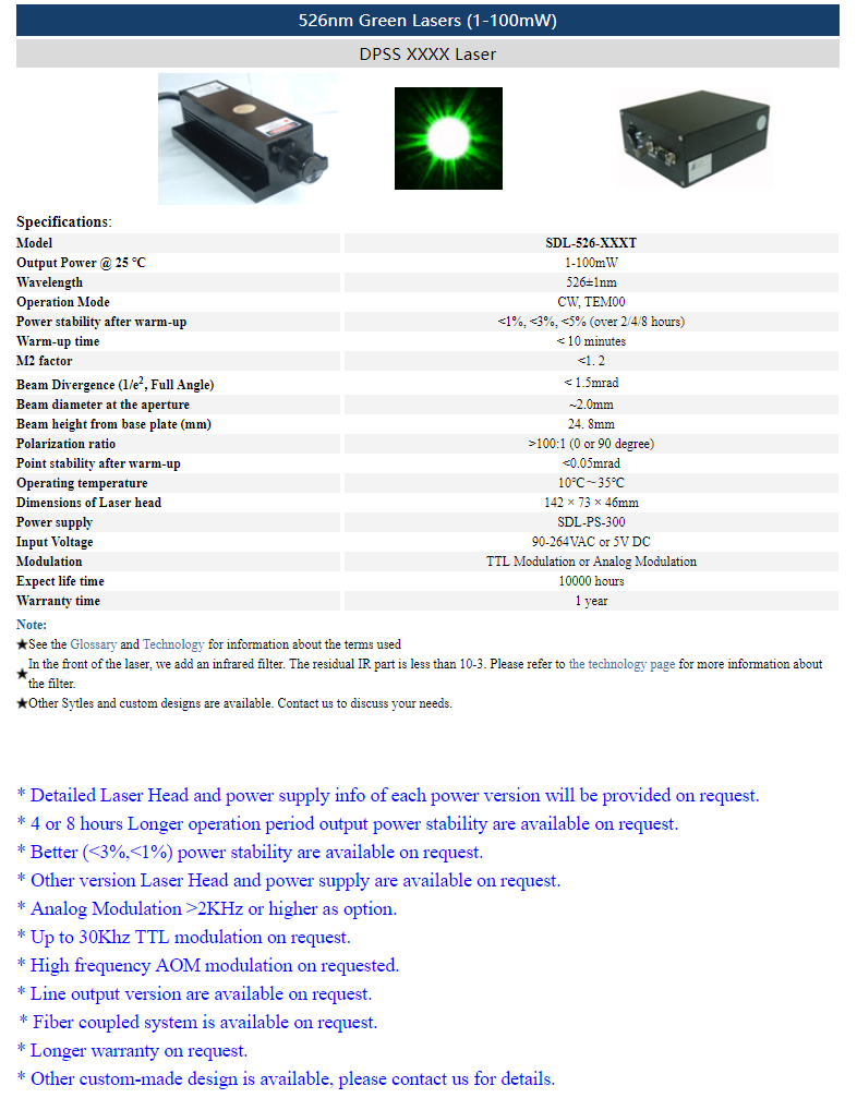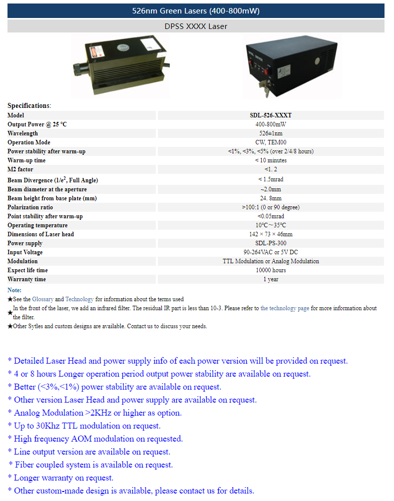 | 526nm | 400 ~ 800mW | CW | TEM00 | |