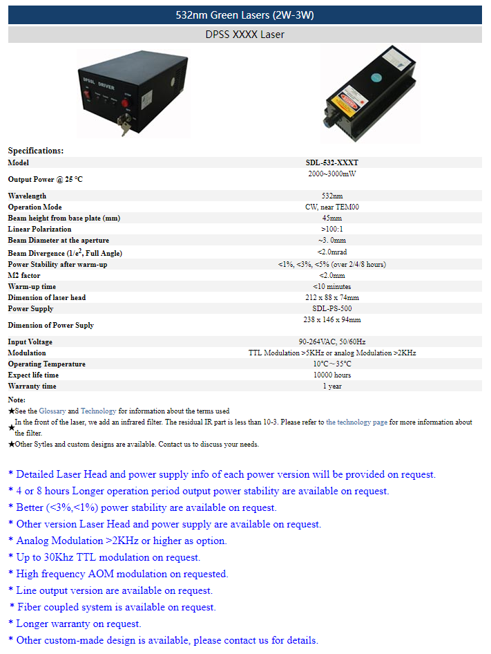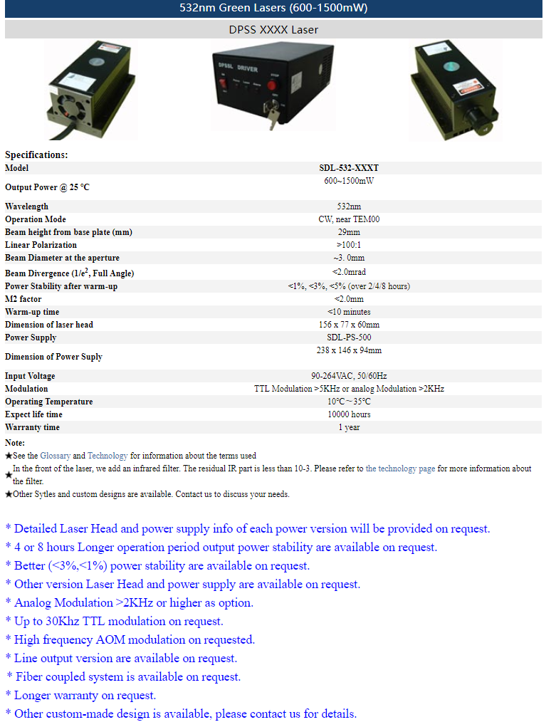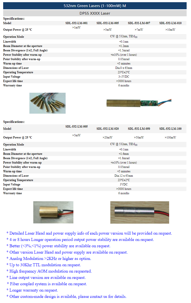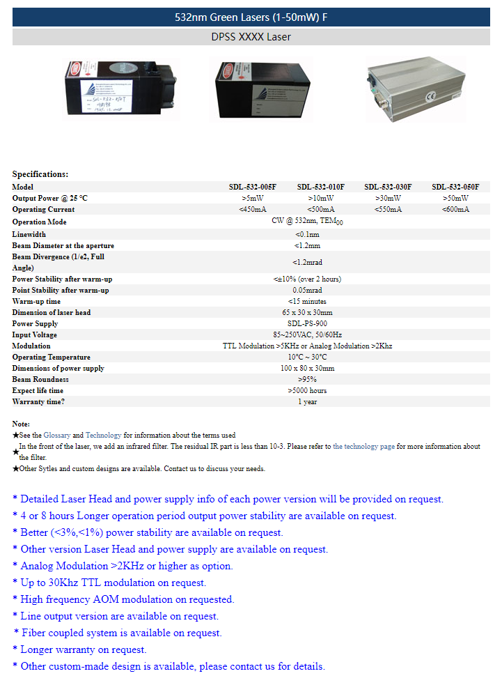 | 532nm | >5mW~50mW | CW | TEM00 | |