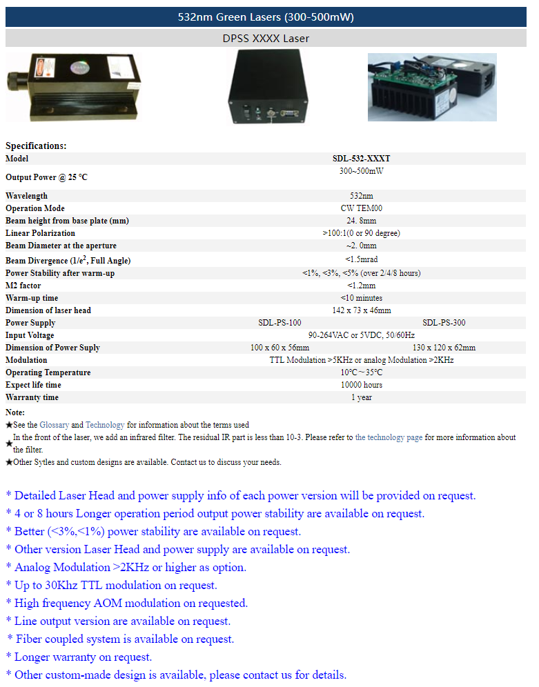 | 532nm | 300 ~ 500mW | CW | TEM00 | |