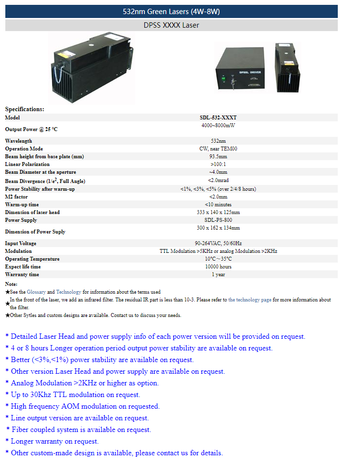 | 532nm | 4 ~ 8W | CW | nearTEM00 | |