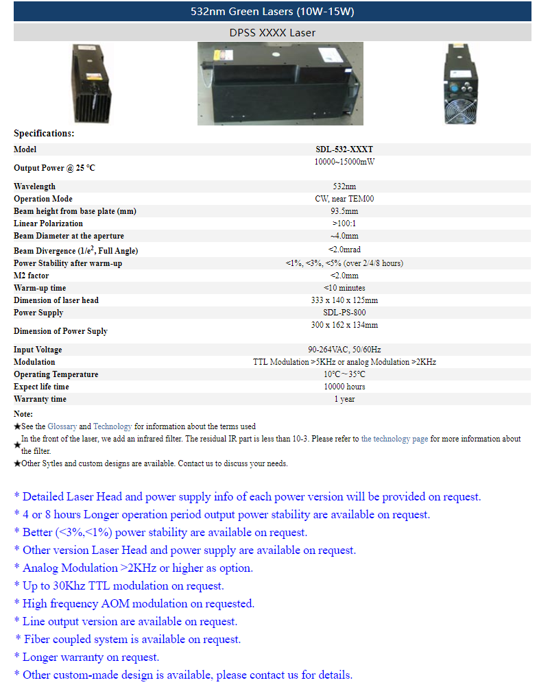 | 532nm | 10 ~ 15W | CW | nearTEM00 | |