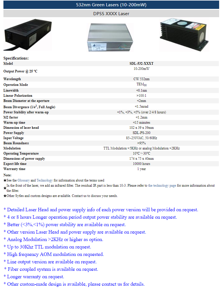 | 532nm | 10 ~ 200mW | CW | TEM00 | |