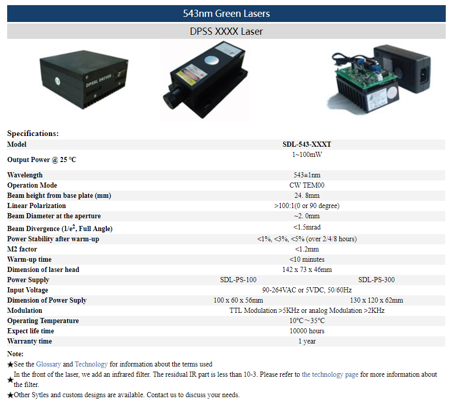 | 543nm | 1 ~ 100mW | CW | TEM00 | |