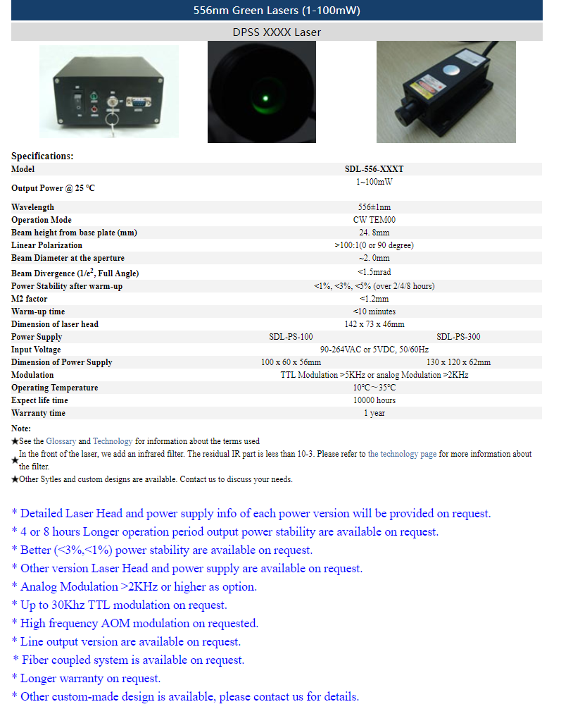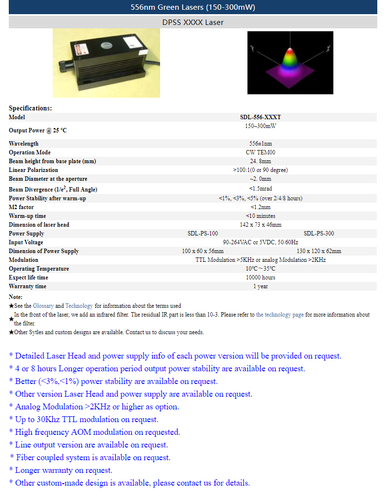 | 556nm | 150 ~ 300mW | CW | TEM00 | |