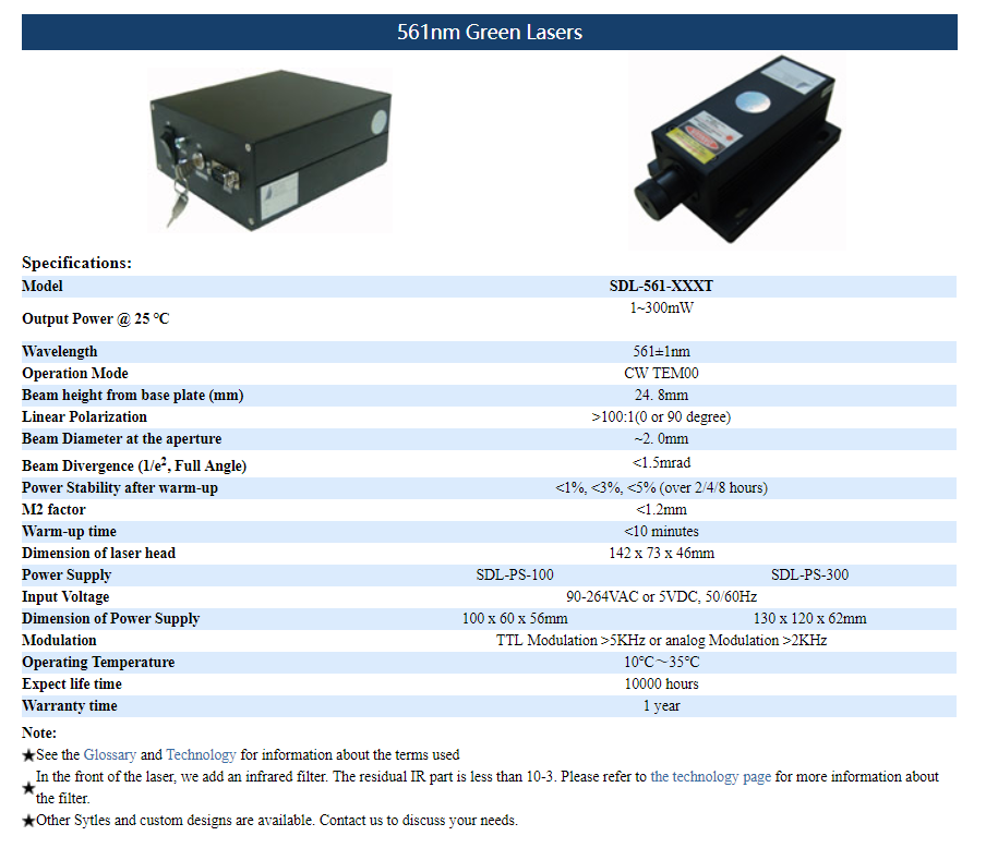| 561nm | 1 ~ 300mW | CW | TEM00 | |