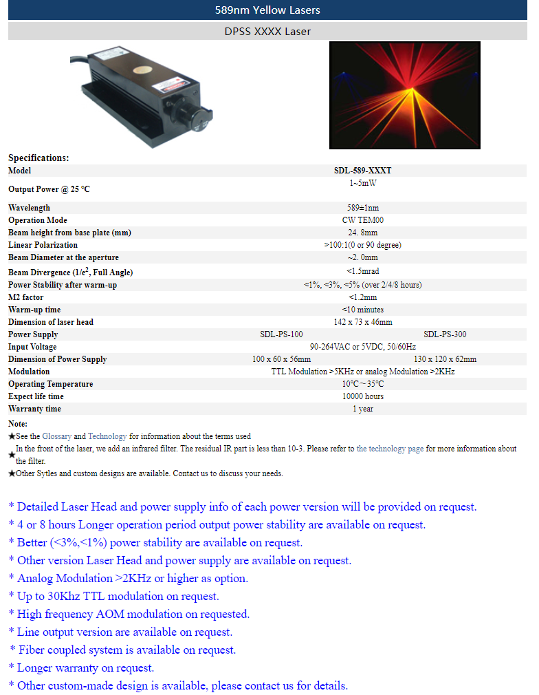 | 589nm | 1 ~ 5mW | CW | TEM00 | |