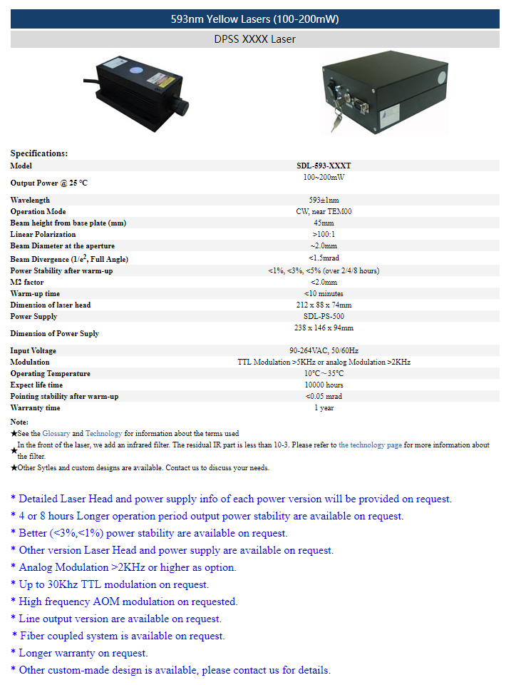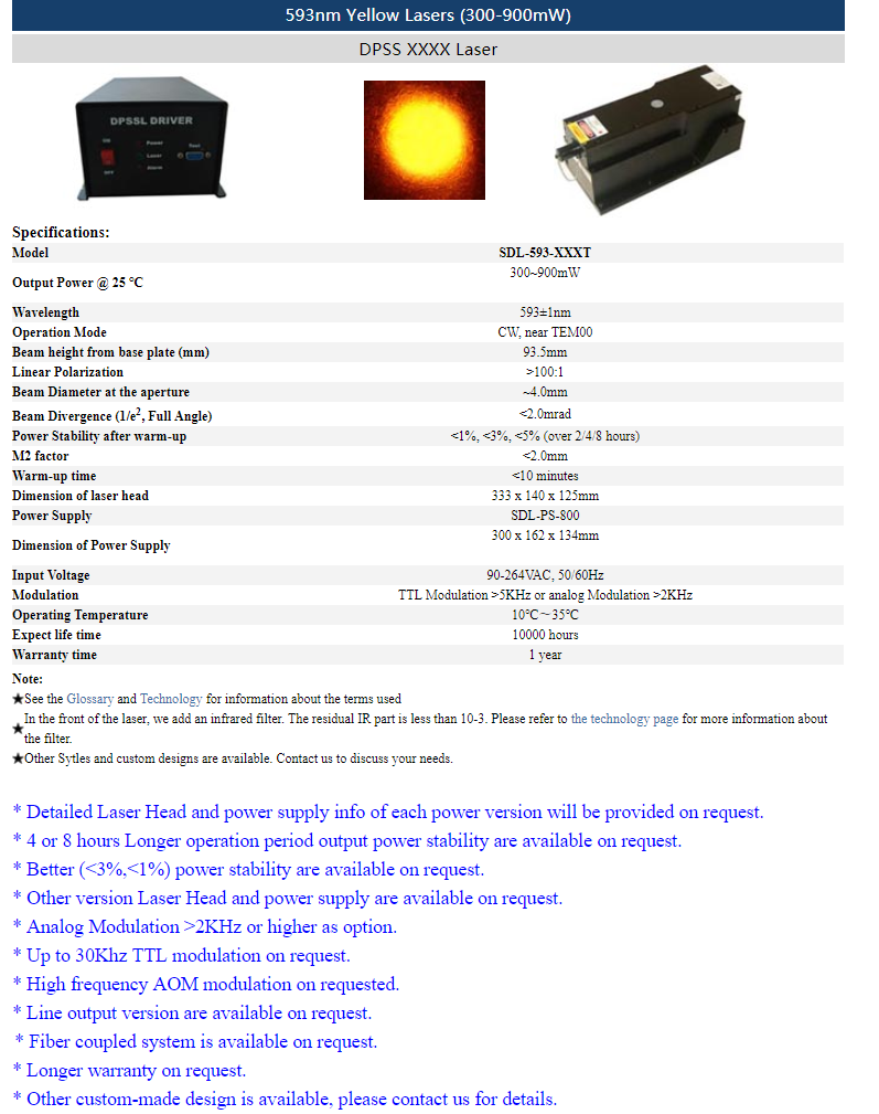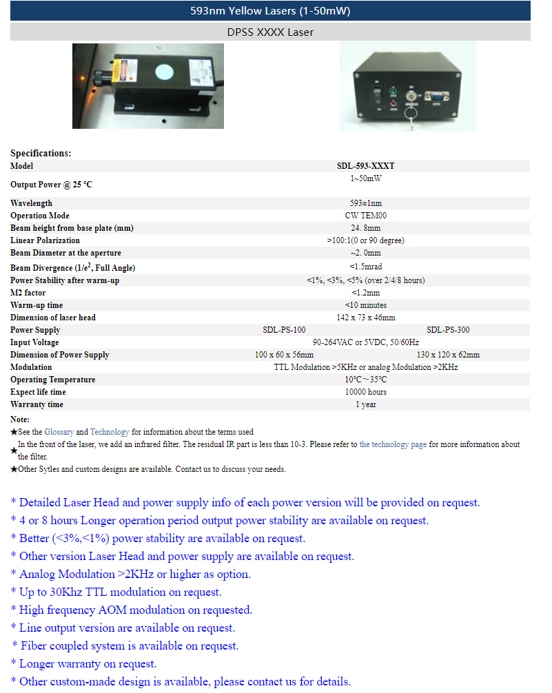 | 593nm | 1 ~ 50mW | CW | TEM00 | |