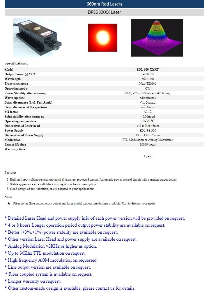 | 660nm | 1 ~ 100mW | CW | nearTEM00 | |