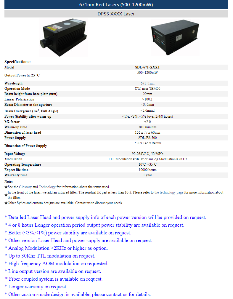 | 671nm | 500 ~ 1,200mW | CW | nearTEM00 | |