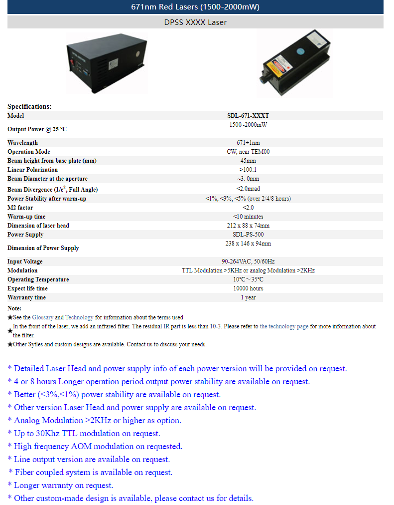 | 671nm | 1.5 ~ 2W | CW | nearTEM00 | |