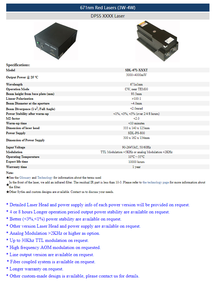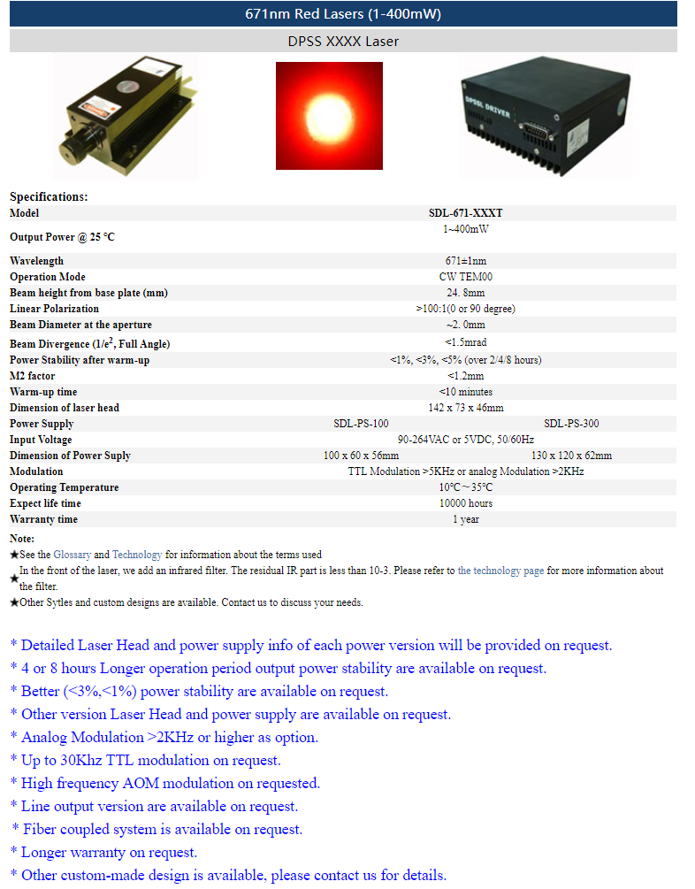 | 671nm | 1 ~ 400mW | CW | TEM00 | |