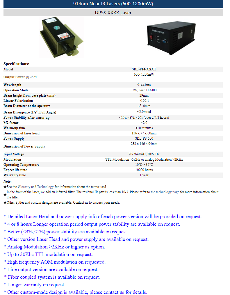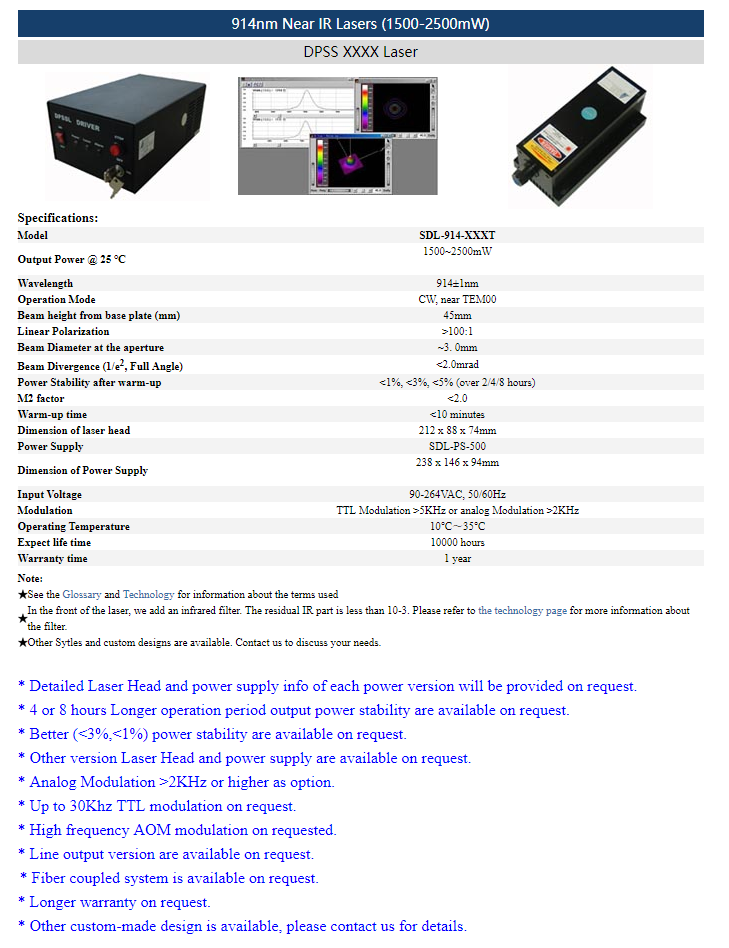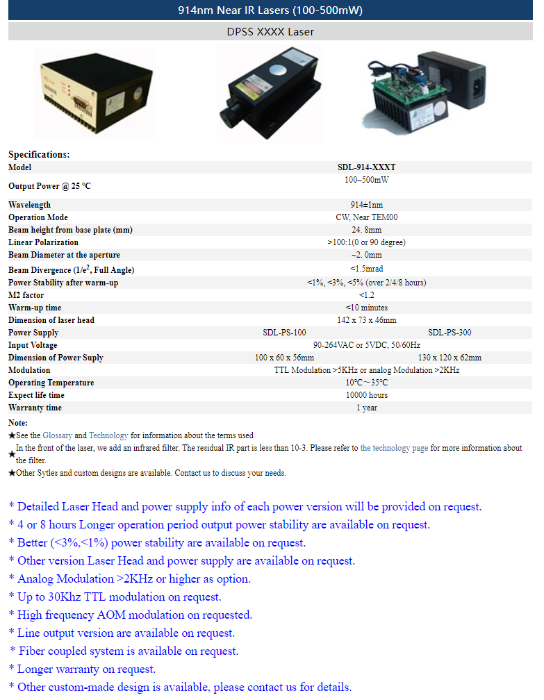| 914nm | 1 ~ 500mW | CW | nearTEM00 | |