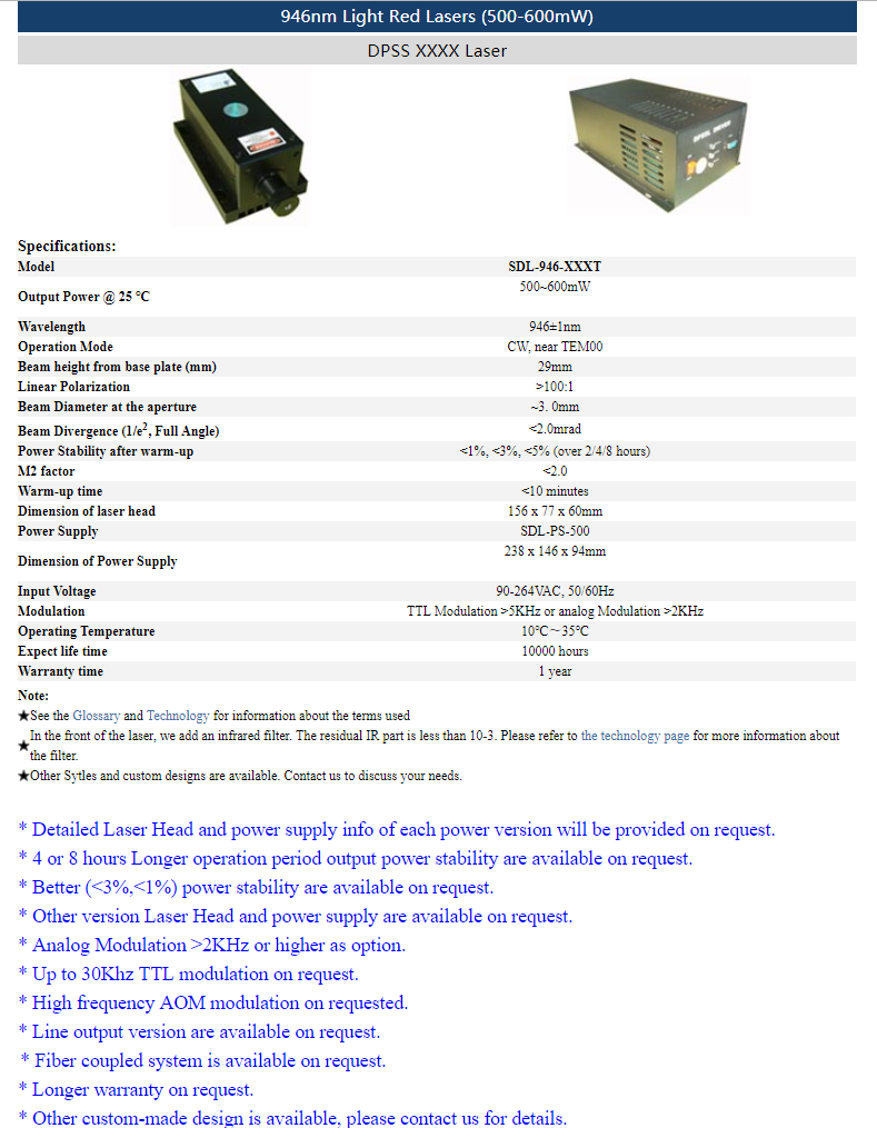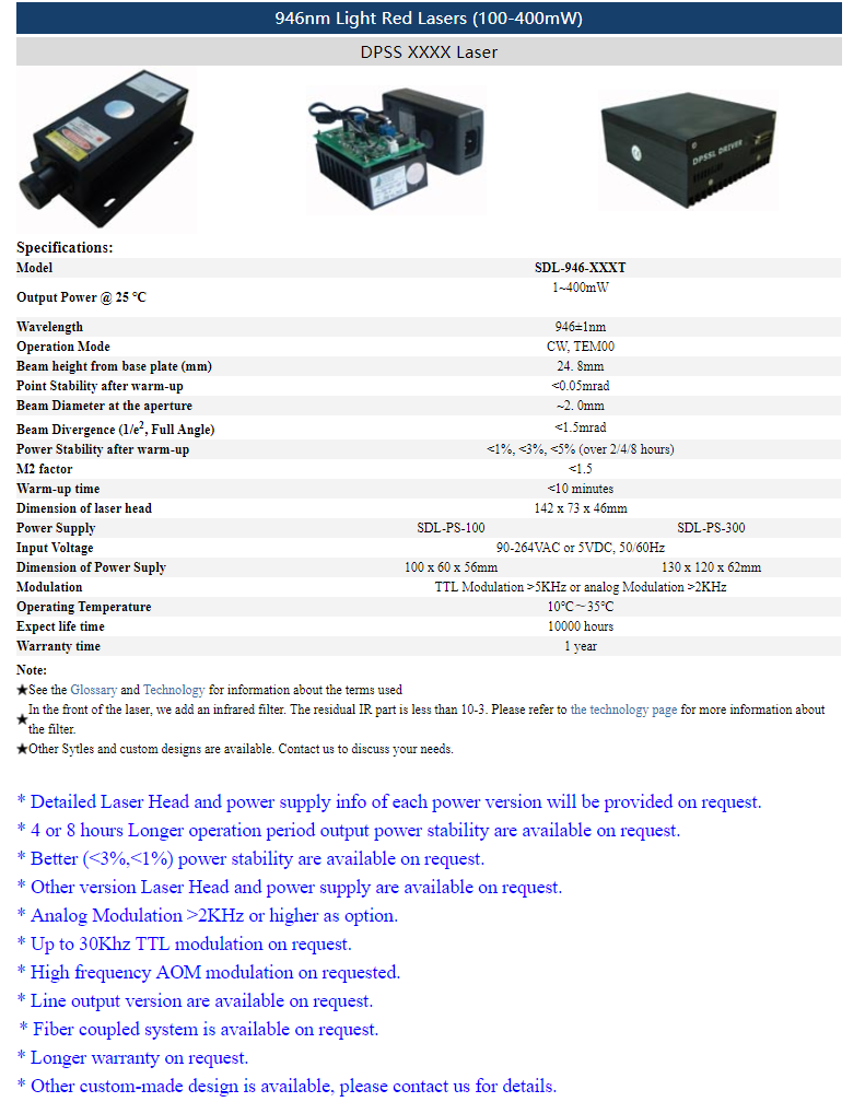 | 946nm | 1 ~ 400mW | CW | TEM00 | |