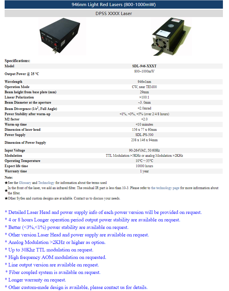 | 946nm | 800 ~ 1,000mW | CW | nearTEM00 | |