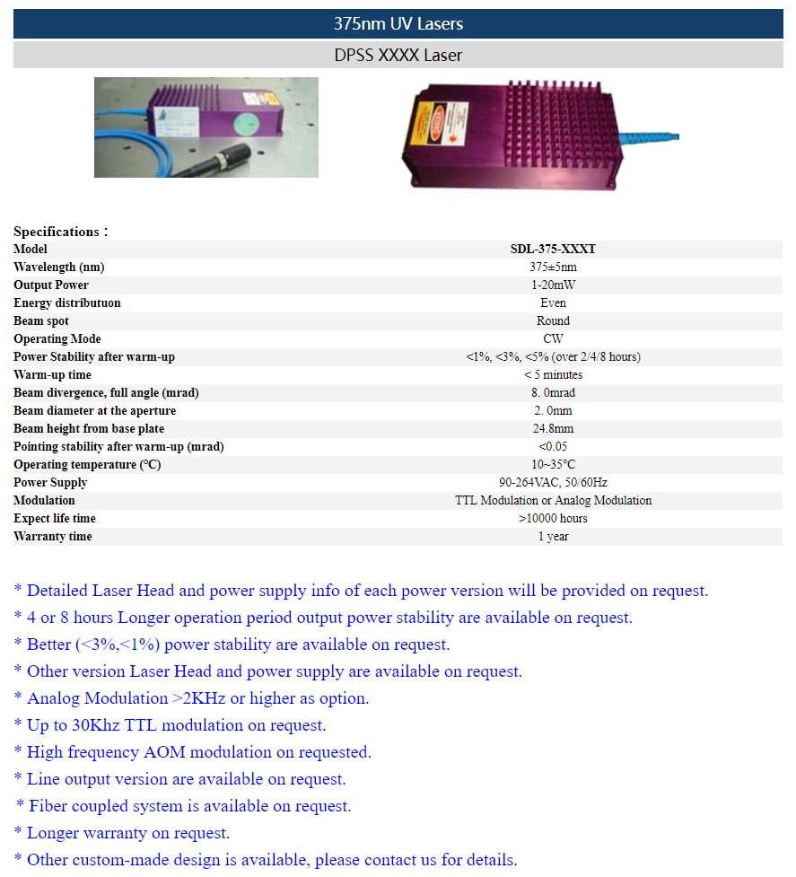 | 375nm | 1 ~ 20mW | CW | ||