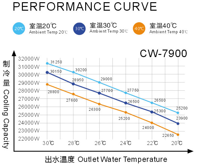 チラーCW-7900-30KWは冷却能力30KWの水冷式小型チラーで、800W – 900W YAGレーザの冷却に利用できます。Modbus-485通信プロトコルでレーザとチラー間のリモート通信制御が可能です。温度制御には、一定温度モードと周囲温度に合わせて調節できる2つのモードがあります。スイッチONで直ぐに動作し、季節によって周囲温度が変わっても自動調節します。
