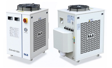 ■製品名:1ポンプ/2温度ファイバレーザ用チラー CW-61001ポンプ/2温度チラーCW-6100は1台のポンプでレーザ本体と光学レンズなどの部品を同時に冷却できるファイバレーザ用水冷式チラーで、700W – 800Wのファイバレーザの冷却に利用できます。コスト節減、省スペース、小型で簡単に移動できる使い易いチラーです。温度制御には、一定温度モードと周囲温度に合わせて調節できる2つのモードがあります。スイッチONで直ぐに動作し、季節によって周囲温度が変わっても自動調節します。