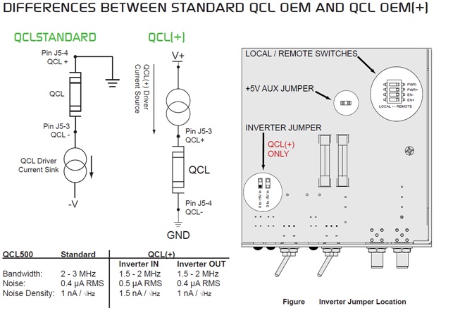 量子カスケードレーザ(QCL)は半導体レーザの1種ですが、通常の半導体レーザと異なり半導体量子井戸中に形成されるサブバンド間の光学遷移を利用するため中赤外からテラヘルツ帯の発光が可能で、温室効果ガスの微量計測、化学物質、有害物質の検知、エンジンの燃焼診断など多くの分野で利用が期待されるレーザです。 WAVELENGTH ELECTRONICS社の量子カスケードレーザ(QCL)用ドライバQCL-OEM+は小型のOEMタイプで、市販では電流ノイズ密度が最も低いドライバです。低ノイズですのでガス、液体、物質などのセンシングにおいて検出感度を上げることができます。このドライバでQCLを駆動することにより、より狭線幅、安定な中心波長や繰り返しスキャンを実現できます。これまでより低濃度測定を実現するためにぴったりの高精度で超低ノイズのレーザドライバです。QCL-OEM+は下図のようにQCL-OEMと電圧の極性が異なるタイプです。出力電流の異なる4種類がございますのでご用途に合わせて最適の機種をお選びください。