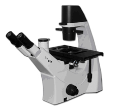 倒立型生物顕微鏡は培養容器を底から観察するのに適した顕微鏡で、主に組織培養検査に使われます。培養容器の底は厚みがあるため対物レンズにはLWD(Long Working Distance)レンズが使用されており、対物レンズを上下させて焦点合わせを行います。