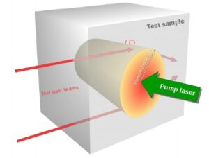 • サンプルへ強い緑色レーザーを照射 ◦レーザ光の一部が吸収されサンプルを加熱 ◦屈折率の局所的な熱変化が起きる ◦2つの横方向テストレーザービーム(赤)の光路が変化 ◦光路変化〜吸収に比例