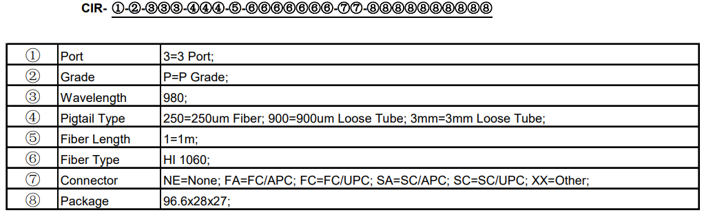 3ポート光サーキュレータは、ポート1に入射した光はポート2で出射、ポート2に入射した光はポート3で出射するように光が進む素子です。本製品は980nm,帯で動作する偏光無依存型の3ポート光サーキュレータです。