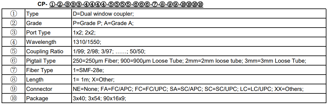 光ファイバカプラは光信号を合分波する部品です。2本の光ファイバの一部を融着延伸してコアを近接化した構造で、一方のファイバに入射した光の一部がもう一方のファイバに分岐します。50/50に分岐する3dBカプラ以外に各種の分岐比のカプラがあります。本製品は1310nm帯、1550nm帯のいずれでも使用できるデュアルウインドウ光ファイバカプラです。Grade Aは標準仕様、Grade Pはハイエンド仕様です。