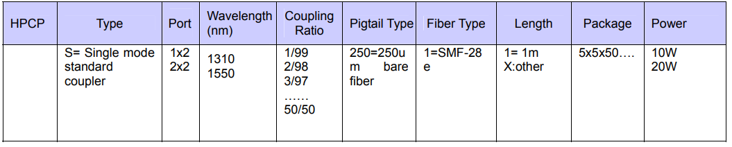 光ファイバカプラは光信号を分岐、合波波する部品です。2本の光ファイバの一部を融着延伸してコアを近接化した構造で、一方のファイバに入射した光の一部がもう一方のファイバに分岐します。50/50に分岐する3dBカプラ以外に各種の分岐比のカプラがあります。本製品はハイパワー仕様で、最大光パワー10Wと20Wがあります。