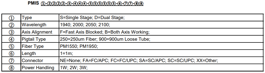 | 内部構成 | 波長 | 動作偏光軸 | ジャケット | ファイバ種類 | ファイバ長 | コネクタ | 許容光パワー |