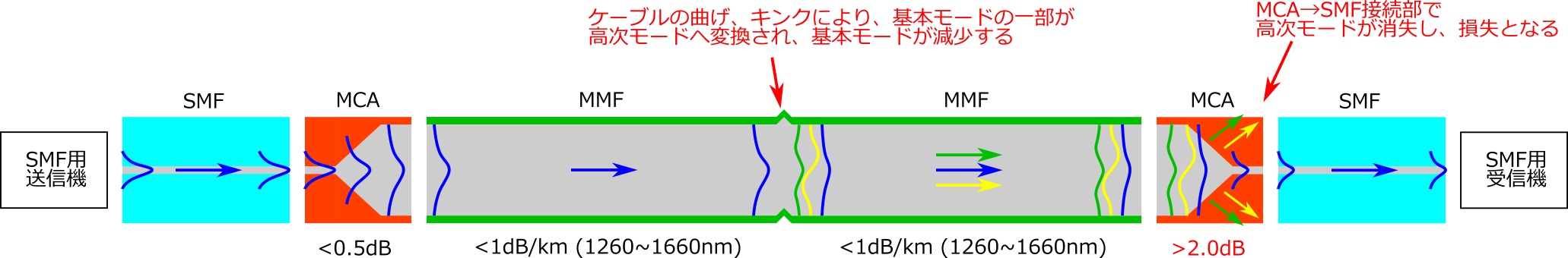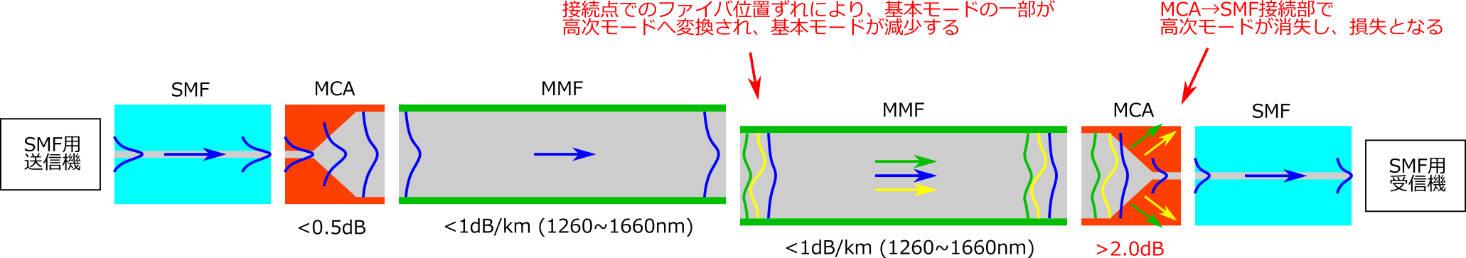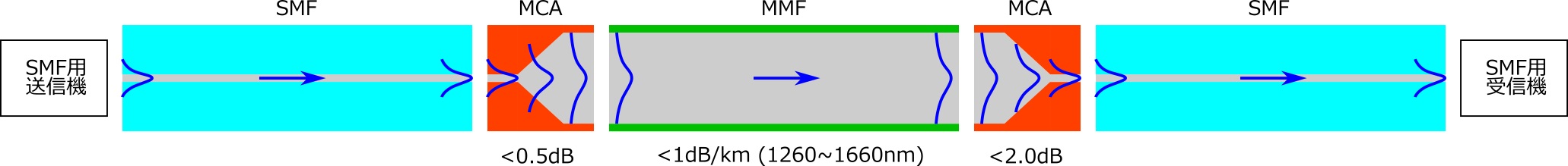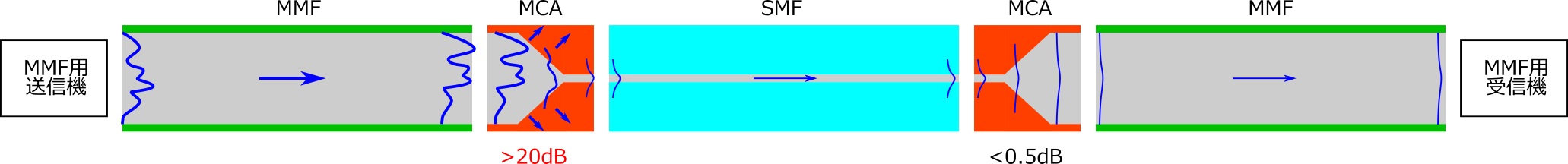 光モード変換アダプタ(Mode Conversion Adapter:MCA)は、シングルモードファイバ(SMF)からマルチモードファイバ(MMF)への入射、あるいはマルチモードファイバからシングルモードファイバへの入射を低損失で行うためのアダプタです。SMFからMMFへは0.5dB以下、MMFからSMFへは2dB以下の損失です。