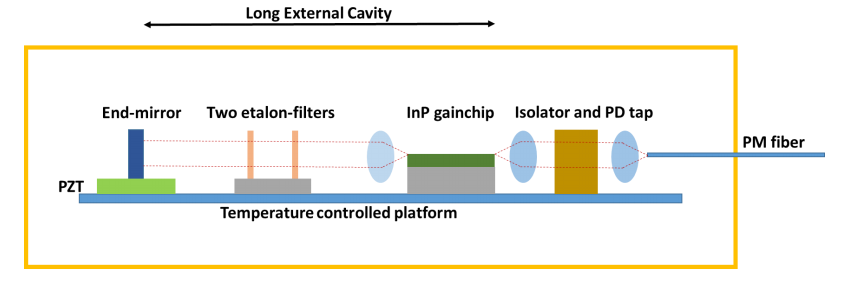 光共振器は、ゲインチップと高反射エンドミラーを備えた外部共振器で構成されます。キャビティ内には、2つのシリコンエタロンフィルターがわずかに異なるFSRで配置されています。透過光は、バーニア効果により、支配的なレーザーピークが選択されます。波長はフィルターの温度を変えることで独立して調整でき、出力はゲインチップの注入電流を変えることで独立して調整できます。