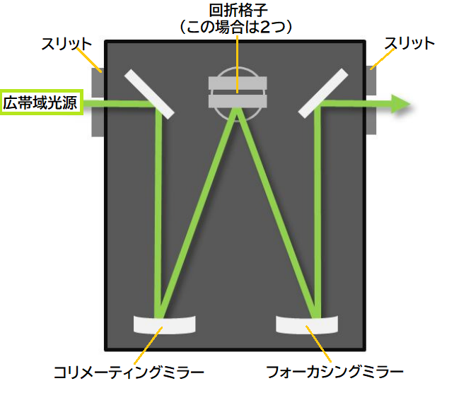 広帯域光源→入射スリットを通過→コリメーティングミラーにより反射→回折格子で回折→フォーカシングミラーで集光→出射スリットで任意の波長のみを通過