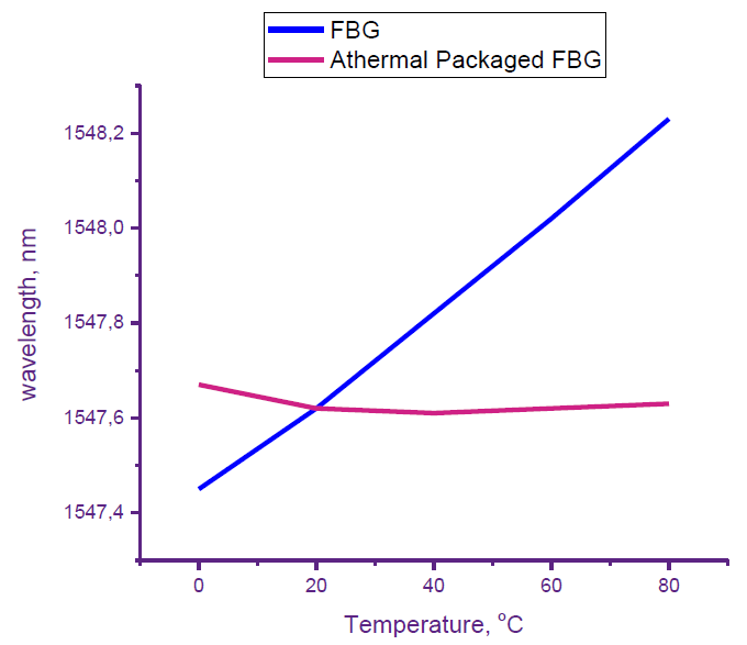 アサーマルパッケージFBG(GTL-FBG-AP-850)は、ケースエレメントの膨張調整と温度の影響下でのFBG波長シフトによって、FBGの熱感度を受動的に補正することを目的としています。FBGは温度変化に敏感です。その熱感度は約6.7ppm/K(波長1550nmで±0.11pm/K)です。アサーマルパッケージFBGは、このような問題を解決し、使用者が広い温度範囲で高い波長安定性を維持しながら、FBGのすべての利点を活かすことを可能にしています。