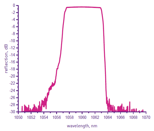 チャープFBG(GTL-FBG-CR-840)は、FBGの周期をファイバの長手方向で連続的に変化させたものです。チャープFBGは、非周期位相マスクを使用して製造されています。位相マスク間隔の有効チャープレートは、0.01nm/cm~30nm/cmです。これにより、チャープFBGは広いスペクトル帯域幅と特殊な分散特性を持っています。この特性を活かして、超高速モードロックファイバレーザ、ハイパワーレーザ、分散補償通信システムの利得平坦化EDFA、ASE光源、バンドストップフィルタなどに利用されております。