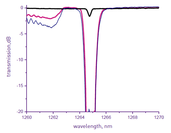 ファイバレーザ整合FBG(GTL-FBG-LP-830)は、ファイバレーザ加工に理想的なソリューションです。出力パワーが数十ワットのレーザで使用したとき、最小挿入損失と最適パラメータを得られます。高反射グレーティングは、約0.5~0.7nm(-20dB)のFWHMを有し、低反射(5%~40%)グレーティングは、FWHM0.15~0.35nmを有します。高反射グレーティングに対する低反射グレーティングのミスマッチは最大±0.1nmです。狭線幅のファイバレーザの場合、調整なしで理想的なマッチングを行いながら、FWHMが約0.1nm以下のFBGを使用できます。