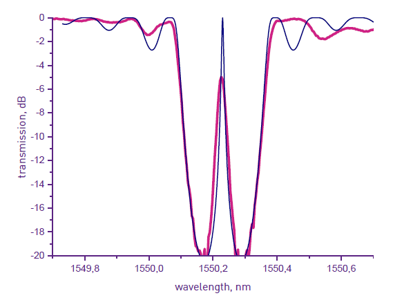 位相シフトFBG(GTL-FBG-PS-870)は、その透過/反射スペクトル内に非常に狭いピークを有します。位相シフトFBGは、周期的屈折率分布の中心部に位相シフトを施したFBGで、グレーティング長がその帯域幅を決定する一方で、そのピークスペクトル幅はFBG両方の部分の強度に依存します。典型値のFWDMは0.1nm~0.005nmの値を有するので、位相シフトFBGは単一周波数(狭線幅)ファイバレーザの製造用に狭線幅光フィルタとして使用されます。