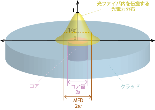モードフィールド径(MFD:Mode Field Diameter)とは、シングルモード光ファイバ内を伝搬する光の断面方向の光電力分布の広がりを表す指標で、光信号がコアからどのくらいクラッド側に漏れ出して伝わっているかを表しています。そのため、MFDは通常コア径よりも若干大きくなります。また、MFDから光ファイバーを接続する際の接続損失を求められるので、接続のしやすさを評価する指標としても使われます。