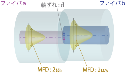 で求められます。2waや2wbなどのMFDが大きい光ファイバでは、損失に大きく影響する指数関数の項が小さくなるので光ファイバ間の軸ずれが接続損失に及ぼす影響は小さくなりますが、MFDが小さい光ファイバでは軸合わせをきちんとしなければいけなくなります。