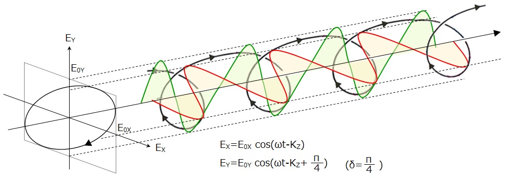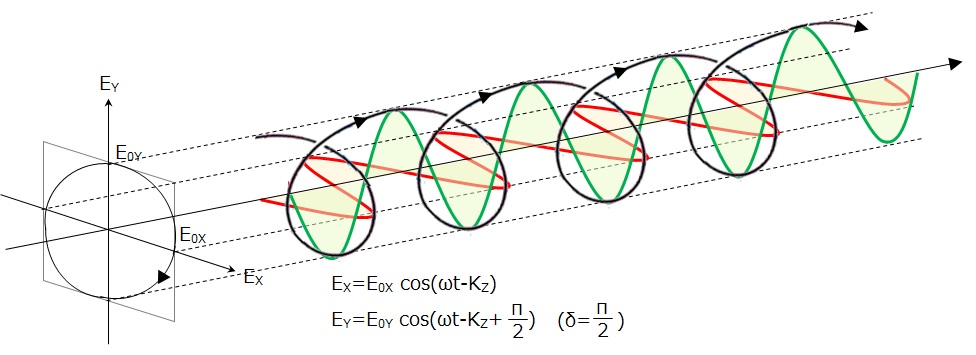 ≪偏光とは≫ 光や電磁波は、電界や磁界が進行方向に垂直な面内で振動しながら進む横波です。偏光(Polarization)とは、進行方向に垂直な面内での電界や磁界(正確には電界ベクトルや磁界ベクトル)が時間的・空間的に規則的な振動をしながら進行する光やそのような光波の状態です。光の進行方向後方から見たときの電界ベクトルの振動(偏り)の尖端が描く軌跡によって直線偏光、円偏光、楕円偏光に分けられます。 光の場合は偏光と呼ばれますが、電磁波の場合には偏波と呼ばれます。 ≪光の種類≫ 光(電磁波)は原子のエネルギーの変化から生まれますが、一つの原子からは10-8秒くらい偏光した光を出し続けるといわれています。電球など熱光源からの光は、様々な向きの膨大な数の原子からの光が集まってできていますので偏光した光がばらばらに重なり合い、全体としては偏光状態が観測されなくなっています。このような状態は、非偏光あるいは無偏光と言われます。太陽からの光(自然光)も非偏光です。 他方、レーザーは電界や磁界の振動方向がそろった(偏った)原子からの光だけを集めて出し続けますので、偏光した光となります。 光は、偏光した光、偏光していない光(非偏光)と、偏光した光と非偏光の光とが混じった部分偏光の光とがあります。 ≪偏光の種類(直線偏光、円偏光、楕円偏光)≫ 均質な媒質中を進む光では、進行方向に垂直な面内の電界(磁界)ベクトルの動きは直交する電界(磁界)の振動成分に分解できることが分かっています。 z方向に進む周波数f、波長λの光は、直交する電界の振動成分をEx、Ey、電界成分間の位相差をδとすると、以下の式で表すことができます。 Ex = E0x cos(ωt – kz) Ey = E0y cos(ωt – kz + δ) ここに、E0x、E0yはx、y方向の最大振幅値、ω=2πf、k=2π/λです。 偏光した光は、E0x、E0yと位相差δによって直線偏光になるか、円偏光になるか、楕円偏光になるかが決まります(図1)。 E0x=E0yの場合、位相差δが0とπで電界成分の頂点の軌跡は直線となるので「直線偏光」と呼ばれます。 また、電界ベクトルが振動する面は偏光面(または振動面)と呼ばれます。 δがπ/2のときには軌跡は右回りの円を描き、3π/2のときには左周りの円となるので、「円偏光」あるいは「右回りの円偏光」、「左回りの円偏光」と呼ばれます。 位相差δが0、π/2、πを除く0からπまでの場合には「右回りの楕円偏光」、π、3π/2、2πを除くπから2πまでは「左回りの楕円偏光」と呼ばれます。 なお、E0xとE0yは直交する座標軸(x、y)の取り方によってE0x = E0yとできます。図1ではE0x = E0yとしています。