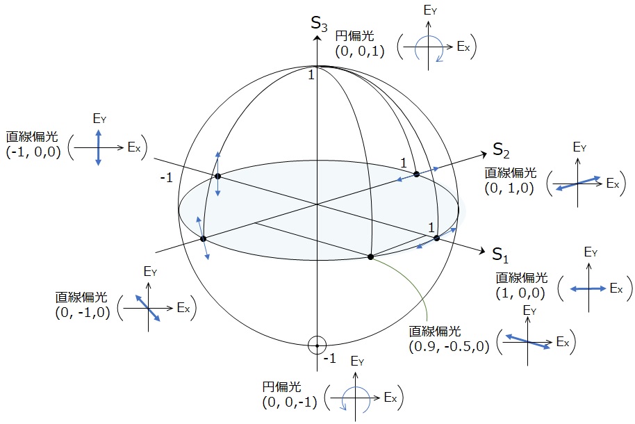 ≪偏光状態の表記(ストークスパラメーターとポアンカレ球)≫ ≪ストークスパラメーター≫ 光の偏光状態は、直交する電界成分の振幅E0x、E0yと位相差δによって決まりますが、これらを直接測定することは難しく実用的ではありません。このため、光の強度測定だけから求めることができるストークスパラメーター(Stokes Parameters)を使って偏光状態を表す方法が使われています。 ストークスパラメーターは、上述したExとEyの式から次のように定義された四つのパラメーターです。 S0 =〈E0x〉+〈E0y〉 S1 =〈E0x〉-〈E0y〉 S2 =〈2 E0x E0y cosδ〉 S3 =〈2 E0x E0y sinδ〉 ここで、〈‥〉は時間平均を表します。 S0は入射光の強度、S1は直交する成分間の強度の差、 S2は+π/4成分と-π/4成分との強度の差、 S3は右回り円偏光と左回り円偏光との強度の差を表しています。 通常、入射光強度S0でS1~S3を割り最大値が1となるように表記します(正規化ストークスパラメーターとも呼ばれます)。方向は+(右)、-(左)で表します。 特徴的な偏光状態のとき、S1=S1/S0、S2=S2/S0、S3=S3/S0は次表のようになります。   表1. 特徴的な偏光状態とストークスパラメーター