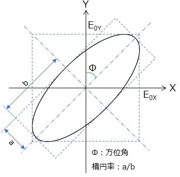 ポアンカレ球では、赤道上の経度2Φの点(cos2Φ、sin2Φ、0)が、偏波面がy軸に対しΦ傾いた直線偏光であることを示します(図4)。 経度0°の点がy軸上の直線偏光、経度180°がx軸方向の直線偏光を表します。 北極は右回りの円偏光、 南極は左回りの円偏光、 北極から南極までの子午線をたどると右回りの円偏光⇒右回りの楕円偏光⇒直線偏光⇒左回りの楕円偏光⇒左回りの円偏光と楕円率が次第に変化することになります。 経度2Φ、緯度2χの点は偏光の軸がy軸方向からΦ傾き、楕円率を表す楕円率角がχの楕円偏光を表します。また、楕円偏光の回転の向きは北半球が右回り、南半球が左回りとなります。