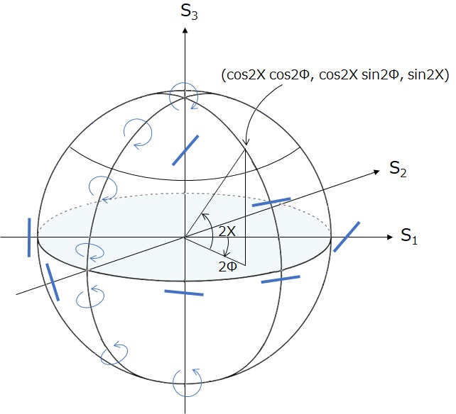 また、ストークスパラメーターのS1、S2、S3は、図3に示すように楕円偏光の長軸がy軸となす角(方位角)をΦ、楕円の長軸(2b)と短軸(2a)から決まる楕円率(a/b)を表す楕円率角をχ( tanχ = a/b )とすると S1 = cos2χ cos2Φ S2 = S1 tan2Φ= cos2χ sin2Φ S3 = sin2χ と変換することができます。 これは、S1、S2、S3を軸とする直角座標を、S0(=1)を動径、2χと2Φを偏角とする球座標に変換することと同じです。
