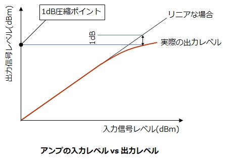 リニアな関係から1dB低くなった時の出力信号レベルを1dB圧縮ポイント(1dB compression point)といいます。
