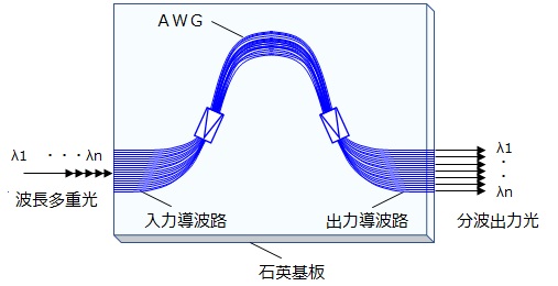 ■AWG(Arrayed Waveguide Grating:アレイ導波路回折格子)光通信に使用される光デバイスです。 石英やシリコン基板上にパターンの異なる多数の導波路を集積して波長ごとに光を合分波するデバイスです。 DWDM通信の