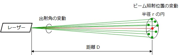 ■ビームポインティング・スタビリティ  (Beam pointing stability)ビームポインティングスタビリティは、レーザービームの出射方向の安定性を示すパラメータです。 レーザービームの出射方向は完全に一定ではなく、時間と共に僅かに変動します。 変動の主な原因は温度変化です。 レーザービーム・スタビリティはこの変動を1℃あたりの出射角の変動として表し、単位は通常[mrad/℃]か[µrad/℃]を使用します。 例えば、レーザービーム・スタビリティが10[µrad/℃]のレーザのD=15cm離れた地点でのビーム位置の変動は、温度変化が2℃のとき、r=15×104[µm]x10-5[rad]x2[℃]=3[µm]となり、r=3µmの円内で変動します。