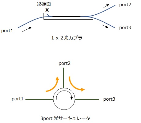 - 3port光サーキュレータでは、本来、port1に入射した光はport2へ出射し、port2へ入射した光はport3へ出射する部品です。