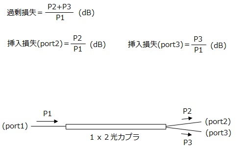 ■過剰損失 (Excess Loss)過剰損失は光カプラの性能を表すのによく使われる用語です。 光カプラの内部で失われる光の程度を示しており、光カプラに入射した光(P1)と全portから出射した光(P2+P3)の強度比で表します。 一方、光カプラにおける挿入損失は、入射した光と各ポートから出射した光(P2, P3)の強度比で表します。 単位はいずれもdBです