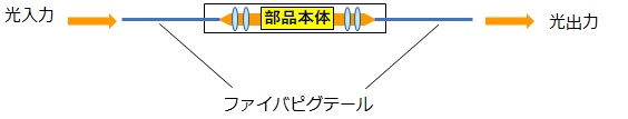 ■ファイバピグテール  (Fiber pigtail)光部品の入力や出力のために取り付けられたファイバをファイバピグテールあるいはピグテイルファイバといいます。 面倒な光軸合わせをしなくても、ファイバピグテールを融着接続することにより光回路を簡単に構成できるので、多くのパッシブ光部品や半導体レーザ、フォトディテクタなどに取り付けられています。