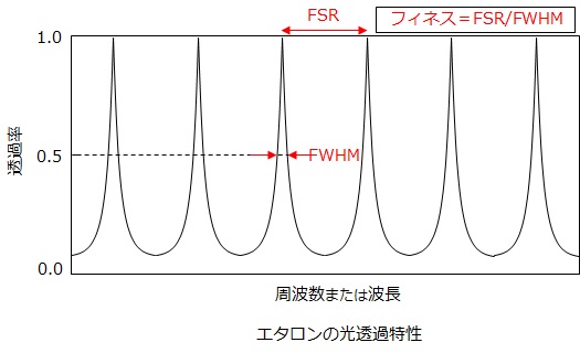 エタロンの特徴は鋭い透過波形が得られることで、FSRとFWHM(半値全幅)との比